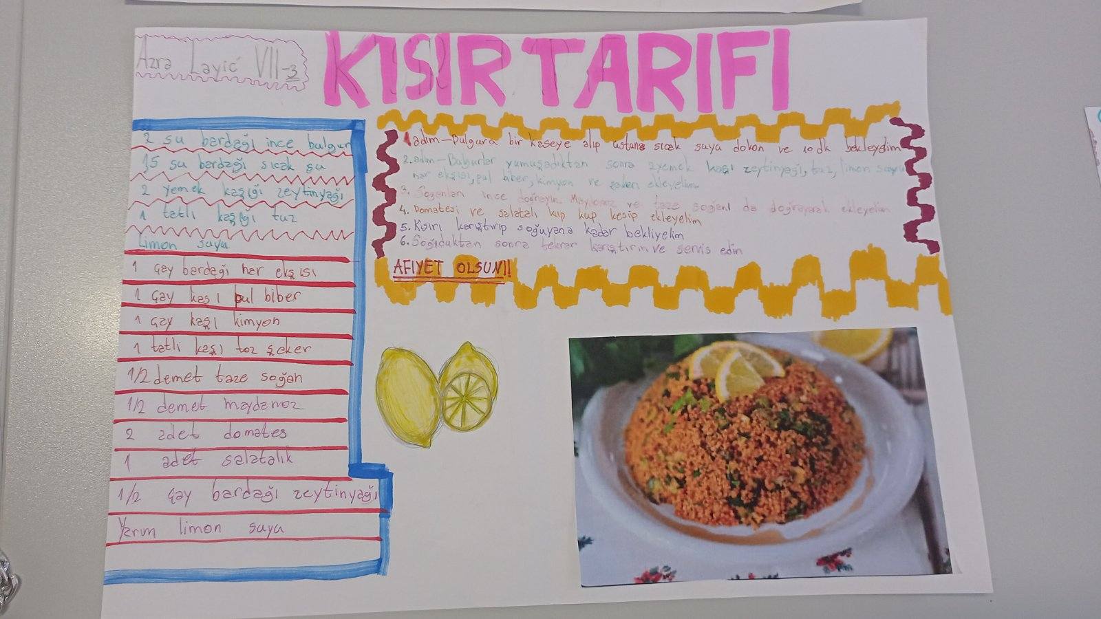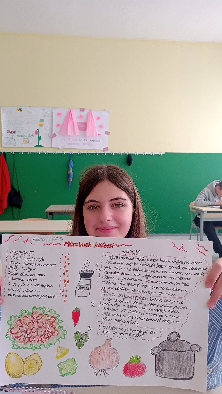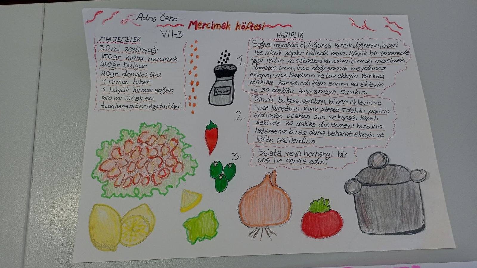 Shodno temi Yemek tarifi (recept za jelo), učenice sedmog razreda su na času turskog jezika ilustrovale i opisale proces pravljenja svog omiljenog jela. Tako smo dobili recepte za čuveni Kısır i Mercimek köfte! Afiyet olsun!