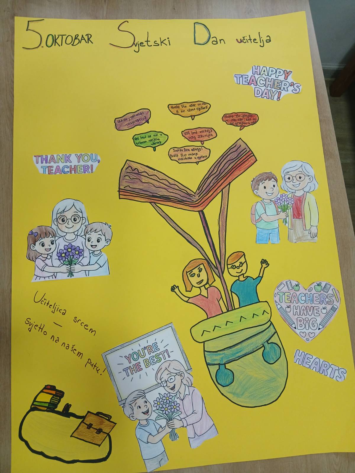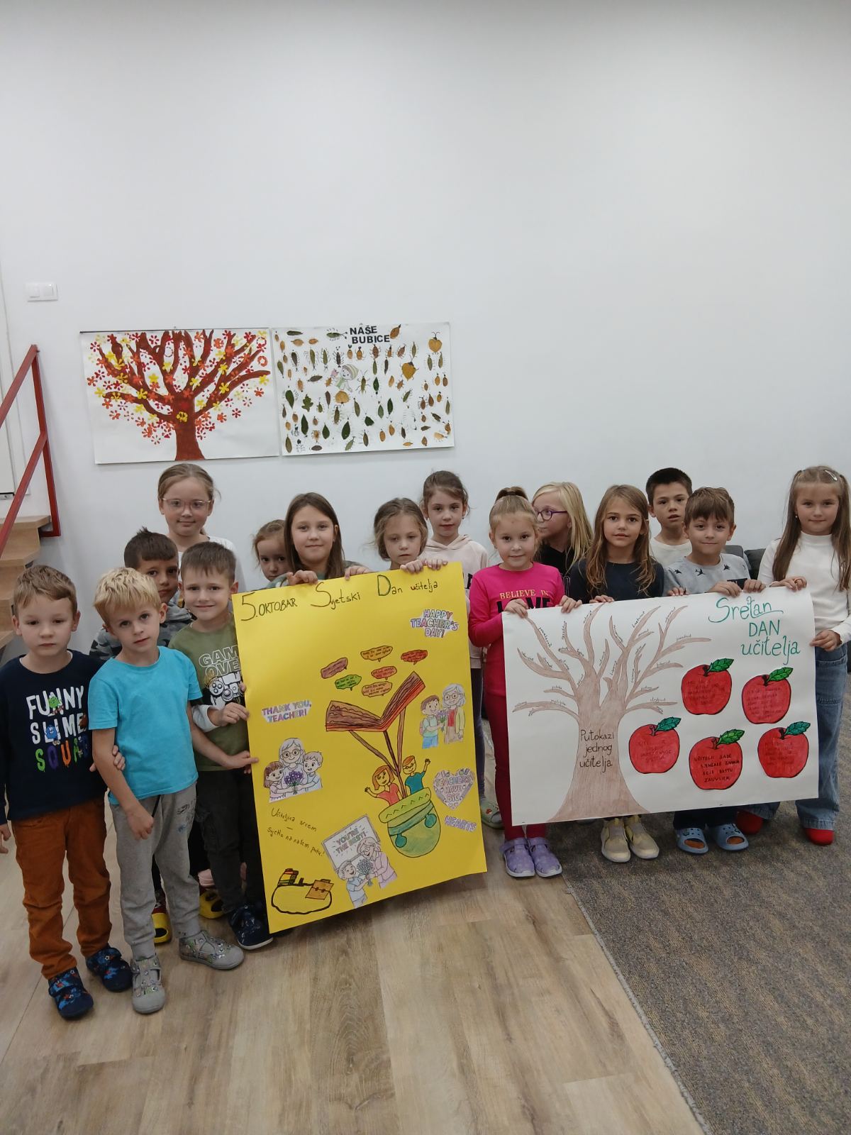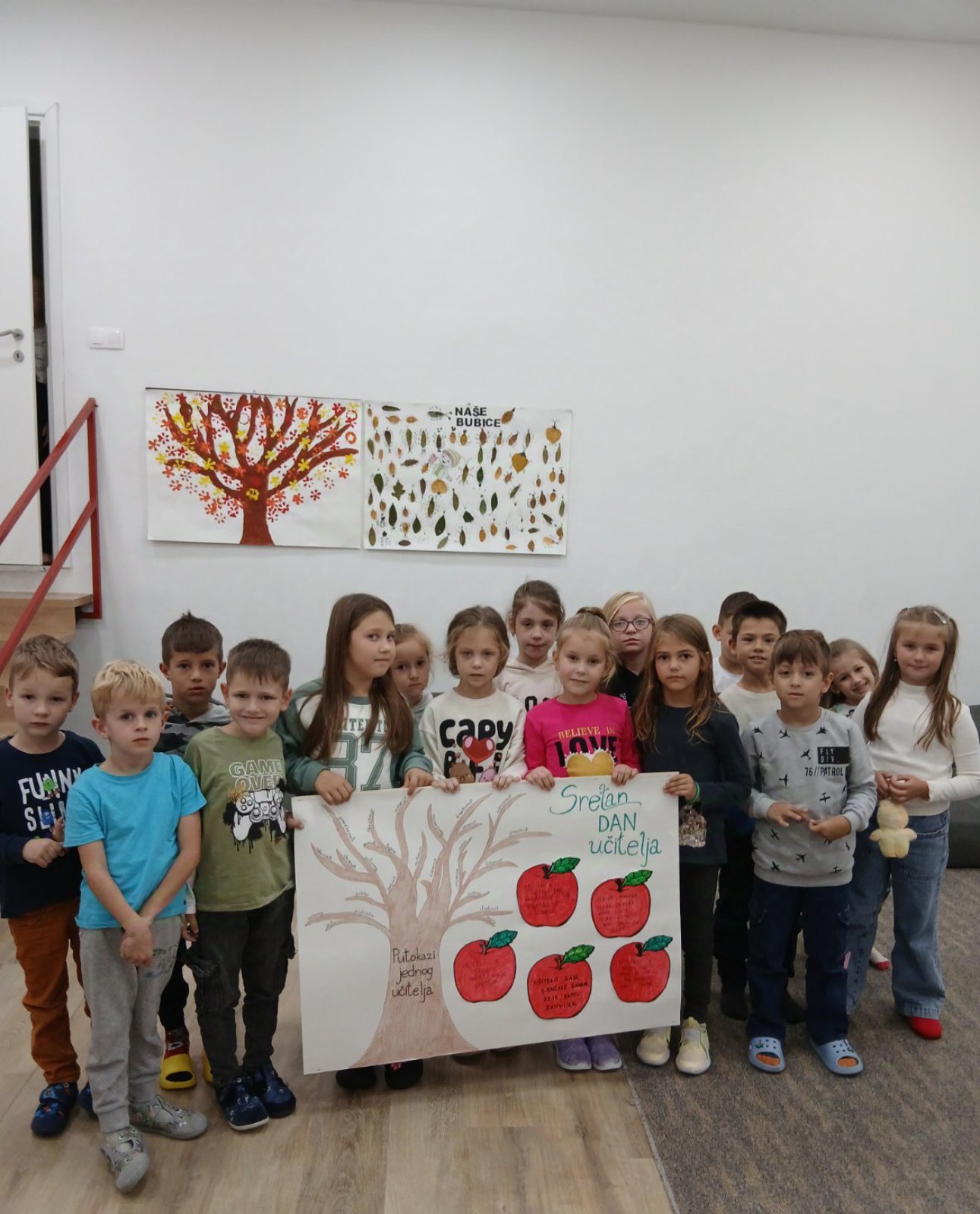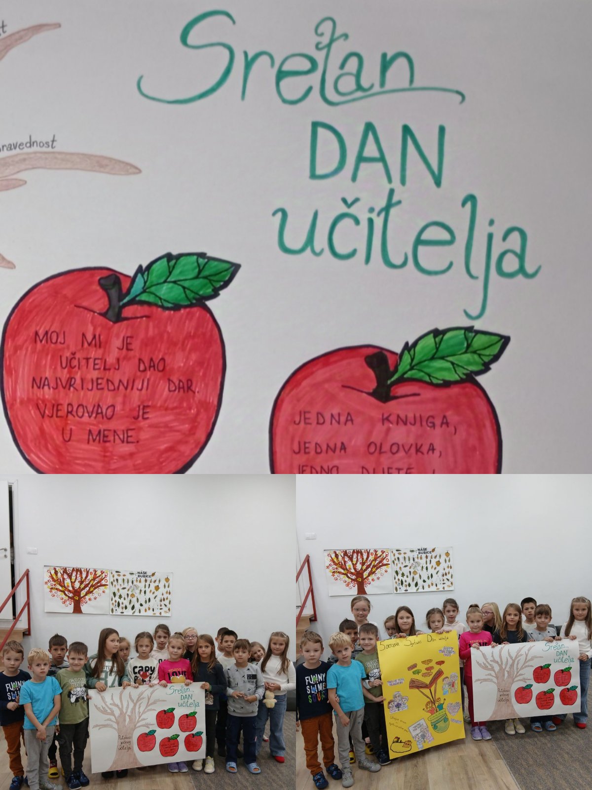 Učitelji imaju jedan od najplemenitijih poziva na svijetu. Oni ne oblikuju samo znanje, već i srca i duše svojih učenika. Svojom strpljivošću, ljubavlju i posvećenošću oni svakodnevno pomažu djeci da rastu, uče i otkrivaju ljepotu svijeta oko sebe. Likovne radove i pano povodom Dana učitelja izradili su učenici prvih, drugih i trećih razreda u produženom boravku zajedno sa svojim učiteljicama. Na taj način učenici su željeli pokazati koliko cijene trud i toplinu svojih učiteljica. Jer… „Učitelji sade sjemenke znanja, koje rastu zauvijek.“ 🌱📚✨
