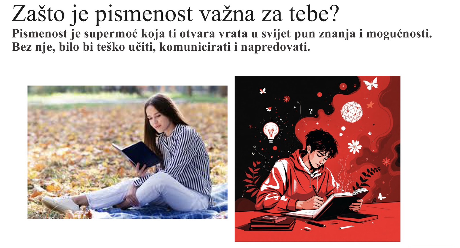 📚✨ 🤔 Jesmo li pismeni ili samo opismenjeni? Još daleke 1965. godine 🗓️ UNESCO je 8. septembar proglasio Međunarodnim danom pismenosti 🌍✒️. I, dok se nekad pismenom smatrala svaka osoba koja zna napisati tri rečenice 📝 koje imaju smisla, život u 21. vijeku 💻📱 je nametnuo nove zahtjeve koji su ovu definiciju promijenili. Danas se pismenom smatra osoba koja: 📖 tečno čita i piše na svom jeziku, 🌐 poznaje bar još jedan strani jezik, 💡 zna se koristiti modernim informaciono–komunikacijskim tehnologijama. 👉 Šta vi možete učiniti za svjetsku pismenost? Evo nekih ideja: – ✍️ nauči mlađeg brata, sestru, rođaka ili rodicu da piše neko slovo (uvijek će to pamtiti) – 📖 pročitaj nekome od njih neku lijepu bajku 🌙🧚‍♀️ ili drugu priču za koju misliš da će im se dopasti – 👵👴 ne zaboravimo ni naše nane, bake, dede i djedove – možda bi i oni voljeli čuti neku priču ❤️ o kojoj poslije možete razgovarati sa njima – 📔🌍 napravi svoj mali Rječnik: u svesku piši riječi našeg jezika ✒️, a pored njih kako se ista ta riječ kaže na engleskom, njemačkom, turskom ili možda nekom drugom koji poznajete. 🎥📊 O značaju ovog dana govori i prezentacija koju vas pozivamo da pogledate.