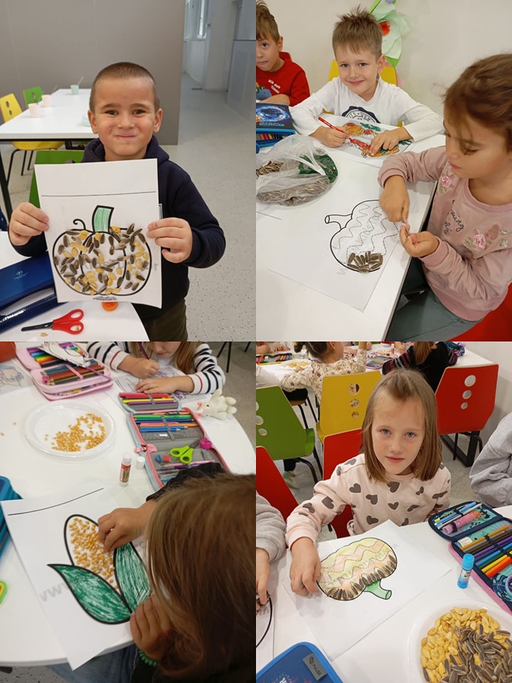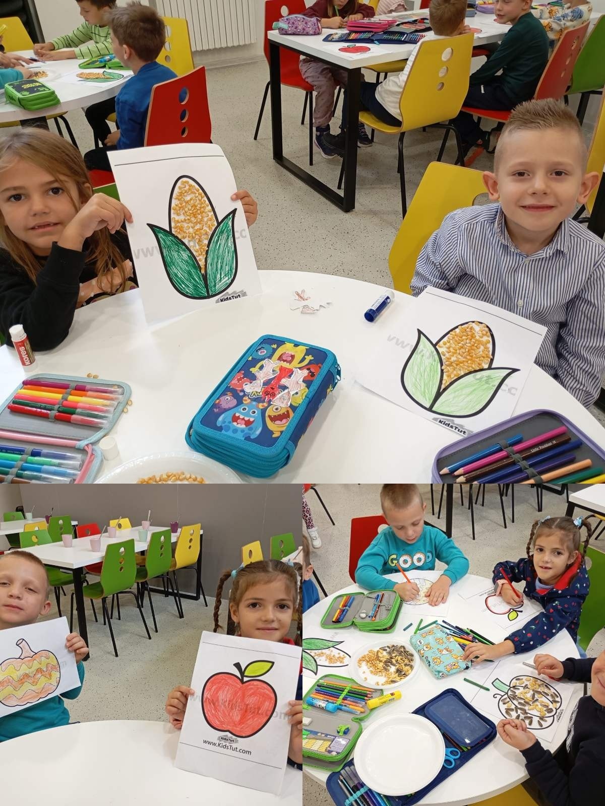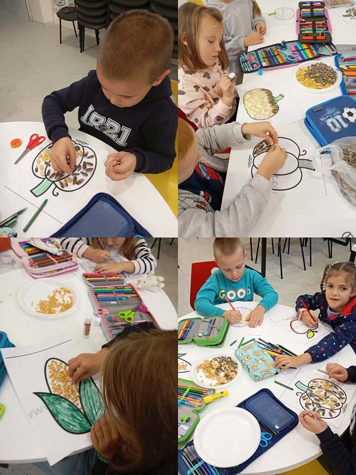 Učenici prvih razreda produženog boravka zajedno sa učiteljicama realizovali su radionicu na temu jesenjih plodova. Kroz aktivnosti spajanja, bojenja i lijepljenja, te korištenjem sjemenki kukuruza i tikve, razvijali su finu motoriku i kreativnost.