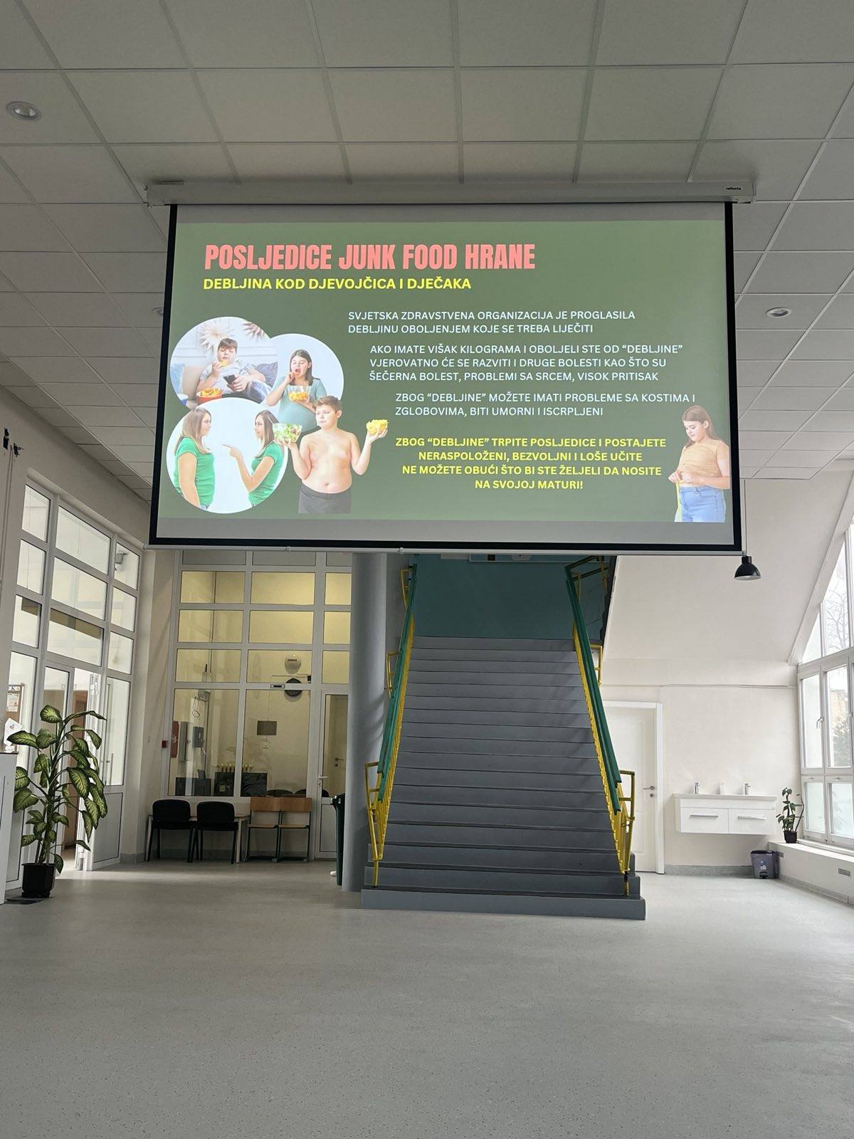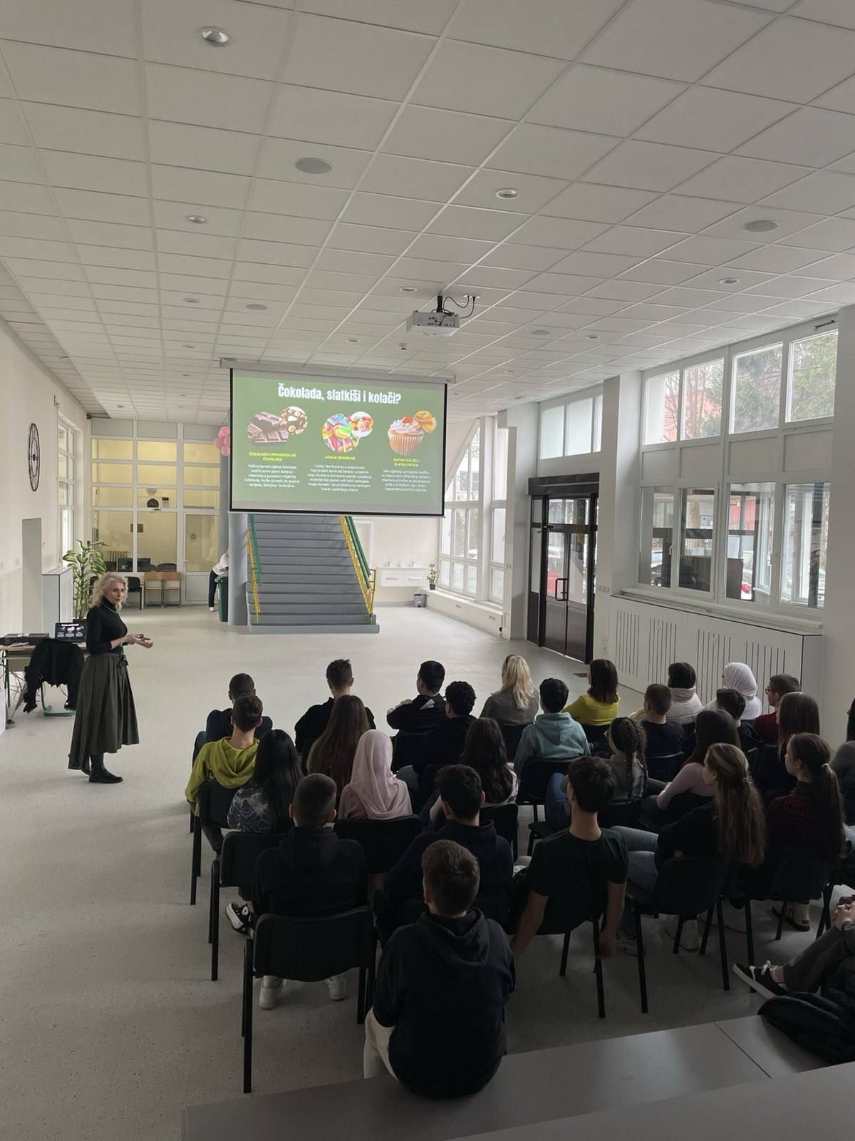 U holu škole održana je edukativna prezentacija o zdravoj ishrani za učenike osmog razreda. Predavanje je vodila dr. Sanja Medić, nutricionistkinja, koja je učenicima približila osnovne principe pravilne ishrane i njen značaj za zdravlje i razvoj. Prezentacija je bila izuzetno korisna i inspirativna, a učenici su stekli važne informacije koje će im pomoći da donose bolje odluke o svojoj ishrani i zdravlju.